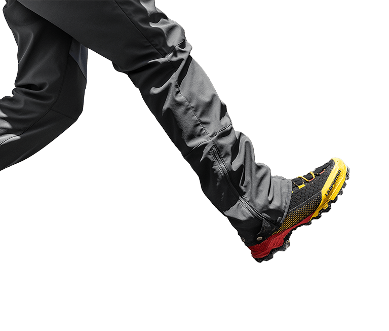 かかとを大きく斜めにカットしたデザインの「ダブルヒールコントラクション」は、接地から重心移動がスムーズな高い推進力を生み、長時間の登山で快適に歩き続けられる。