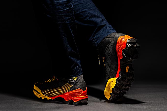 アウトソールとミッドソールを一体化した「Vibramデュラステップ&スプリングラグテック」を採用し、登山靴とは思えない軽さを実現。