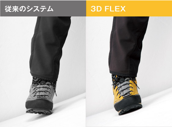 トラバース時の歩行性能を維持する足首部のフレキシブルな可動システム「3Dフレックスシステム」が進化。くるぶしを包み込みながら支える特殊な形状を加え、今まで以上のフィット感を実現しながらテクニカルな足運びをサポート。より自然な歩行感を導き出している。
