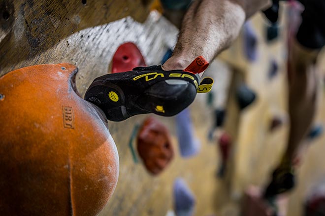 エッジがないつま先は、広い面で壁に接地でき、マイクロホールドのような細かいスタンスにも立ち込める。