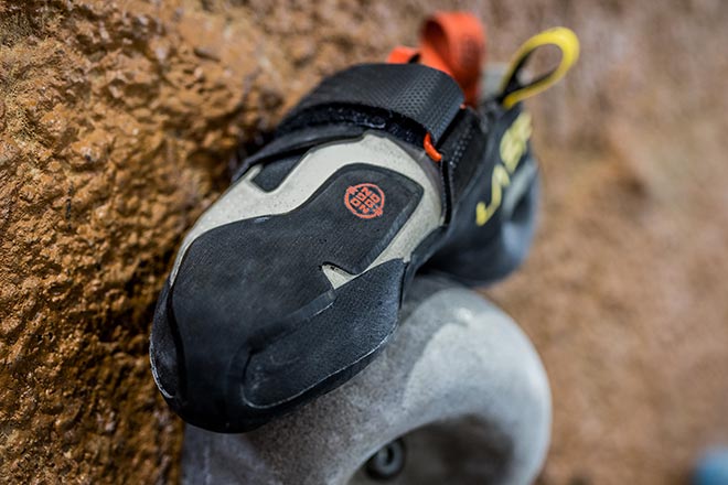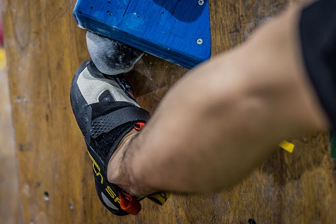 かきこみや正対、トゥフックを多用するクライミングにいいですね。剛性が高いので、安定もします。