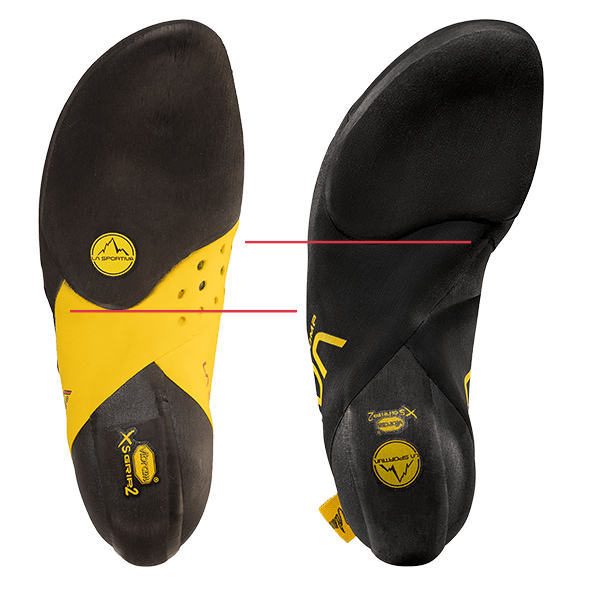 クライミング中に体重を支える前足部のサポート性を高めながら、スメアリングやエッジングで必要な中側部以降の屈曲性と柔軟性を確保。