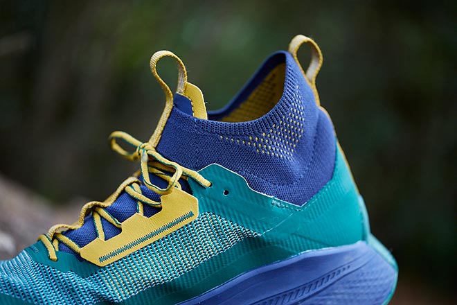 履き口に備えた「ニットカラー」が、足首を包むようにフィット。足とシューズとの一体感を高めながら、ゴミや小石等の侵入を防ぐ。