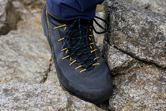 レザーアッパーとラバートゥプロテクションを組み合わせ、高い耐久性と足に馴染むフィット感を両立。岩稜帯での擦れや衝撃から足を守る。