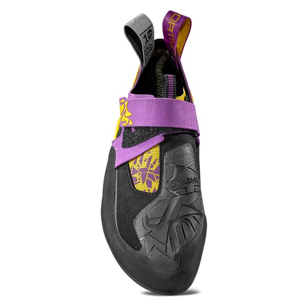 高い足技を持つクライマーは、ホールドを足で掴むように登りますが、スクワマのソールに入った三角のスリットはつま先の自由度を高め、ホールドをキャッチしやすい構造になっています。また、柔軟性の高さからスメアリングにも適しており、ハリボテにベタっと足を置いても安定。様々なフットワークに対応します。踵部には新採用のテクノロジー「Sヒール」を搭載したハイパフォーマンスモデルです。